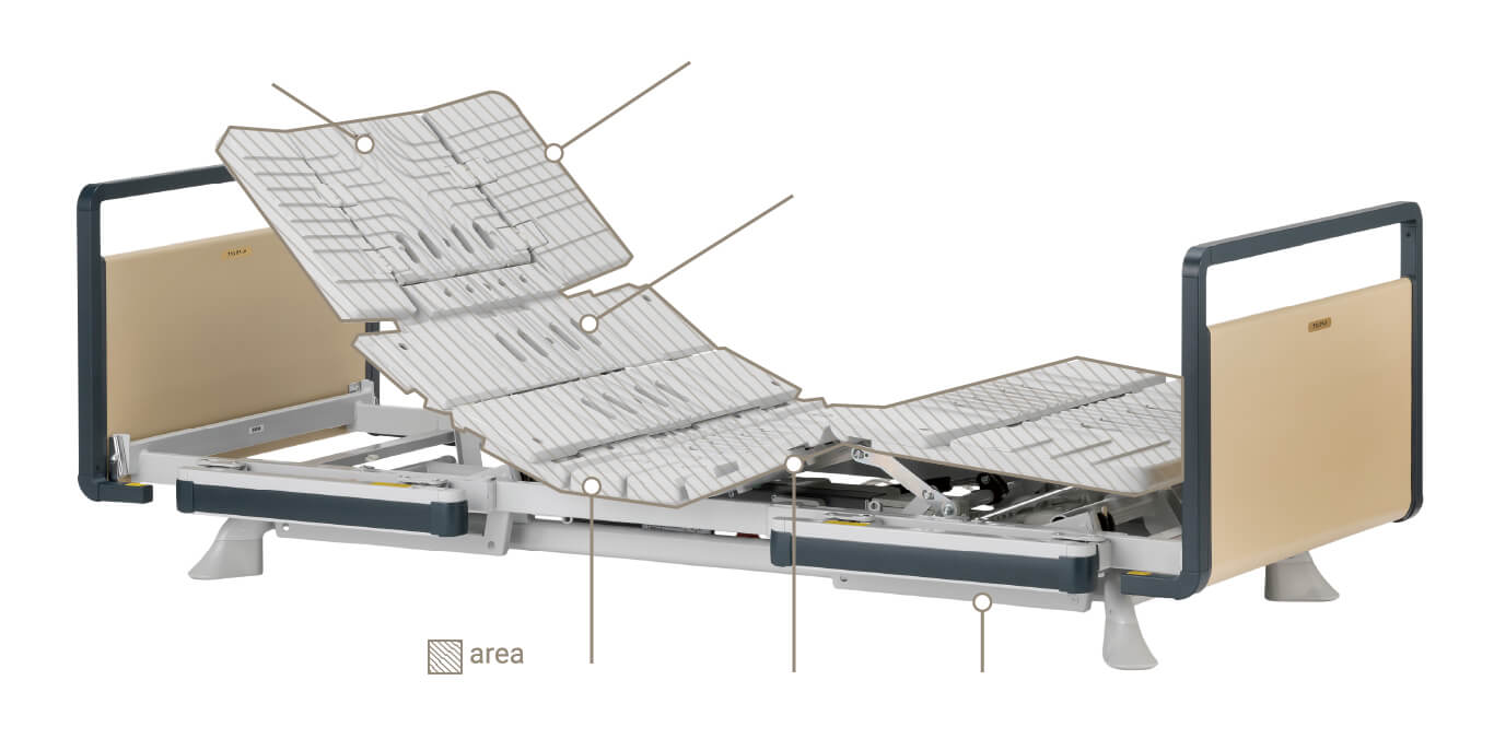 Normal care beds move up and down in an arc rather than up and down, but Multi-Fit Bed moves up and down vertically, which saves space.